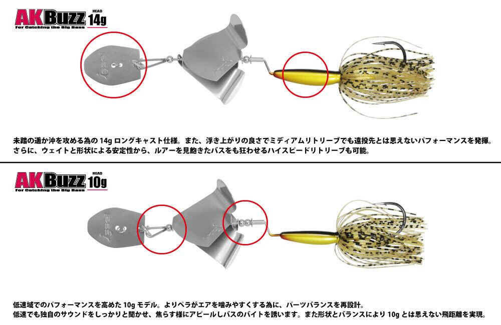 巻くだけでバスを狂わせる事、そのパフォーマンスを遠投先で発揮できる事がAK Buzzのコンセプト。一文字形状により高い遠投性を持ち、 オカッパリからでも広範囲をカバー。また、フロントブレードにより遠投先 でも素早く浮き上がり、安定して水面をリトリーブし続けることができます。 また2枚1組のペラはコンパクトサイズながらも複雑な音と水流を生み、 バスの本能を刺激しバイトを誘います。