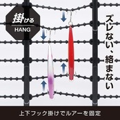 伸縮するシリコーンハングにルアーを張った状態で掛けるので、ルアー同士が動いて針が絡まる等のトラブルを防ぎます