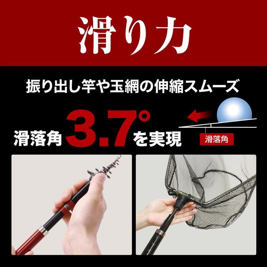●特殊シリコーン被膜により、滑り性を向上させることができます。摩擦を軽減し、振り出し竿等の滑らかな伸縮を可能にします。