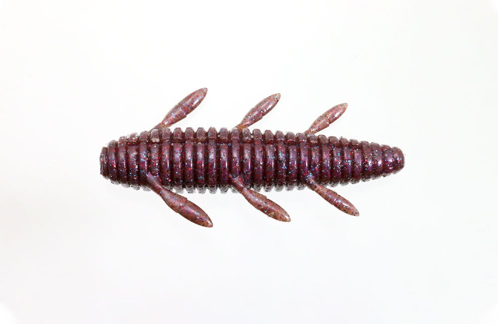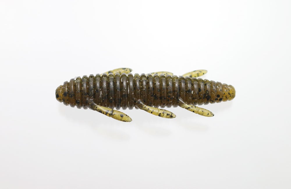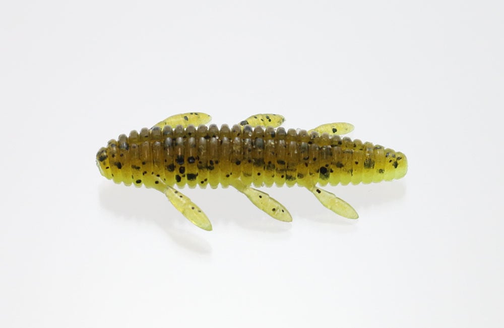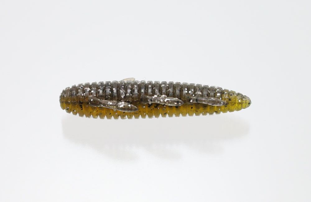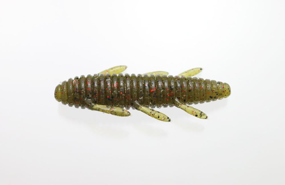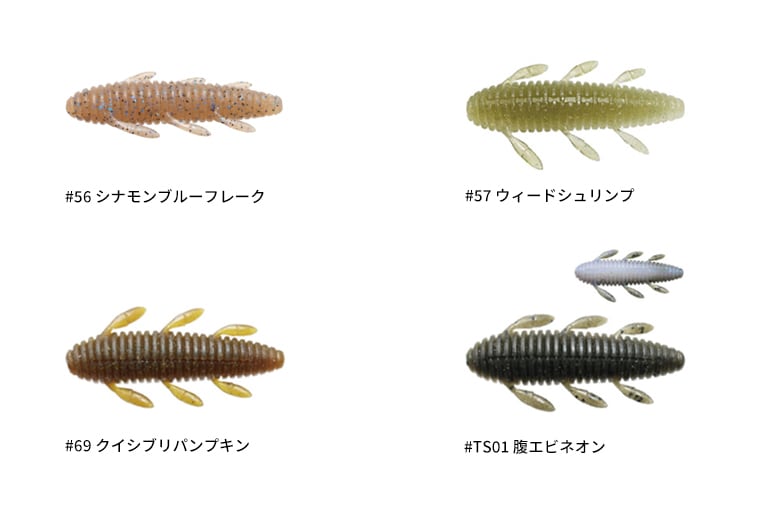 シンプルかつ爆発力のあるワームです。高比重マテリアル、流線型ボディにより驚異的な飛距離が得られます。ボディの細い方からオフセットフックをセットして下さい。ノーシンカーでは脚をピリピリ動かしながら水平気味にフォールします。ボディの太い方にネイルシンカーを装着すると、バックスライドセッティングとなります。