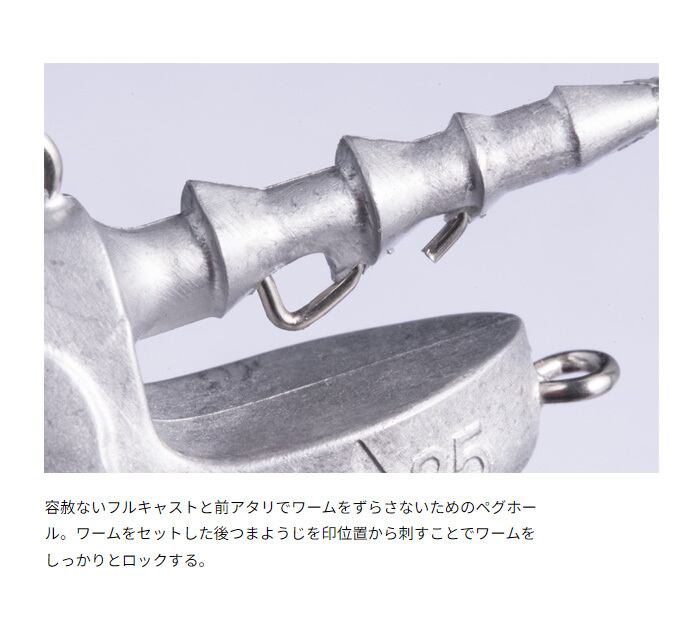 ■超スライドフォール! グライディーは東京湾アイランドクルーズ遠藤正明氏と共同開発したフラットフィッシュ用のジグヘッド。超低重心設計という特徴的な形状で、この形状とフックアイのバランス、ワームの抵抗で、テンションフリーでの大きなスライドフォールを可能にした。スライドフォールの利点は様々で、垂直フォールに比べ水中での滞空時間が長くなるので、対象魚に発見されやすくなったり広範囲にサーチが可能となる。着底後はワームが少し浮いた状態でやや前傾姿勢となり、ヘッドの姿勢と重みでフックが食い込みやすくなるバランスでデザインされており、対象魚の口へのかかり方も抜群。フックはがまかつ社ケン付きタチウオSTRというフックをベースに特注で生産したオリジナルフックで、ロングキャストでラインスラッグが出ている状況でも鋭いフックがしっかりと掛ってくれる。ワインド的にも使用可能で手前によりにくいダート性能を発揮。高い操作性と取るための性能が濃縮されたのがグライディーだ。