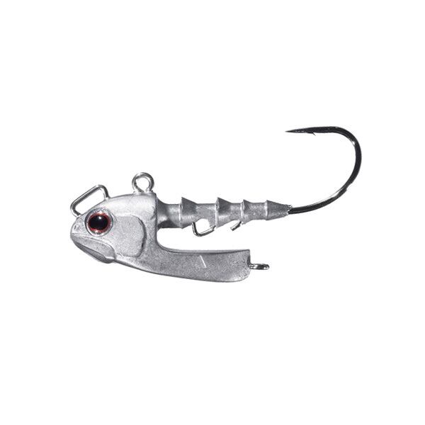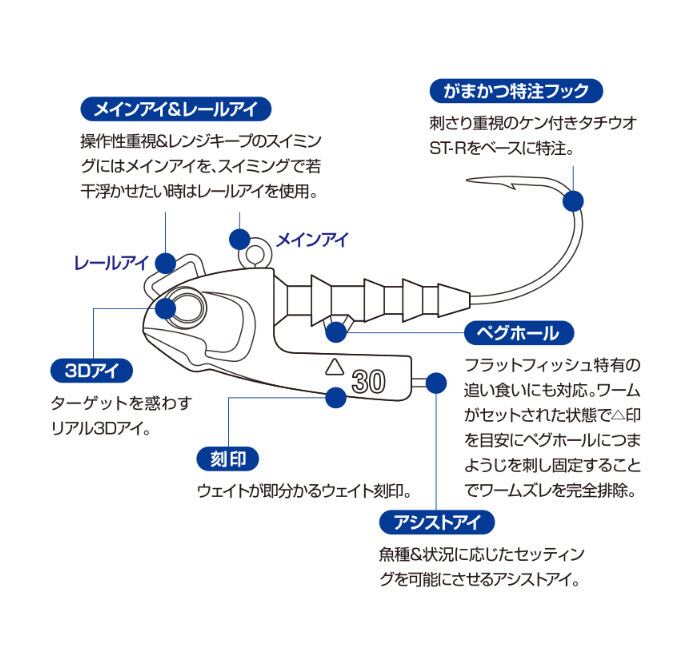 ■超スライドフォール! グライディーは東京湾アイランドクルーズ遠藤正明氏と共同開発したフラットフィッシュ用のジグヘッド。超低重心設計という特徴的な形状で、この形状とフックアイのバランス、ワームの抵抗で、テンションフリーでの大きなスライドフォールを可能にした。スライドフォールの利点は様々で、垂直フォールに比べ水中での滞空時間が長くなるので、対象魚に発見されやすくなったり広範囲にサーチが可能となる。着底後はワームが少し浮いた状態でやや前傾姿勢となり、ヘッドの姿勢と重みでフックが食い込みやすくなるバランスでデザインされており、対象魚の口へのかかり方も抜群。フックはがまかつ社ケン付きタチウオSTRというフックをベースに特注で生産したオリジナルフックで、ロングキャストでラインスラッグが出ている状況でも鋭いフックがしっかりと掛ってくれる。ワインド的にも使用可能で手前によりにくいダート性能を発揮。高い操作性と取るための性能が濃縮されたのがグライディーだ。